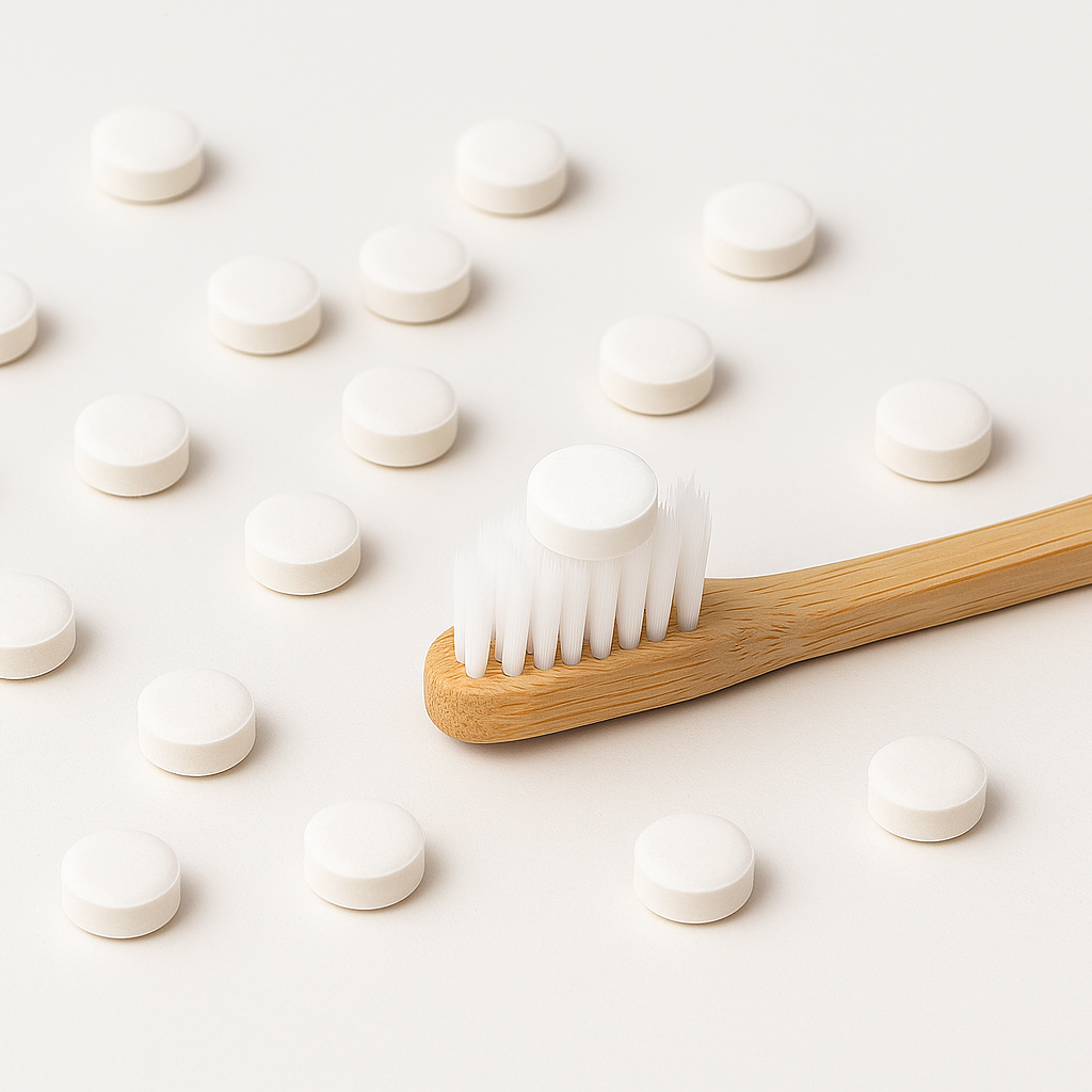 Our toothpaste tablets come in a reusable glass container topped with a sustainably sourced bamboo lid, designed with the planet in mind. This packaging helps reduce plastic waste while bringing a clean, natural aesthetic to your countertop. It's our way of making sustainability part of your daily routine.